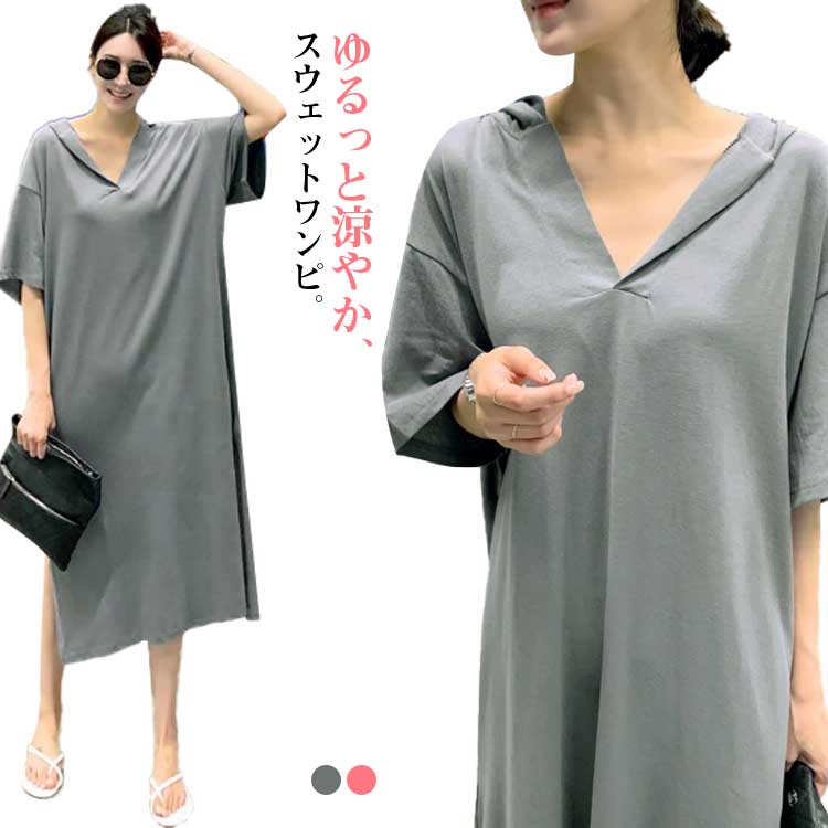 ロングワンピース フード付き レディース 半袖 五分袖 半袖 スウェット パーカーワンピースレディースファッション ワンピース