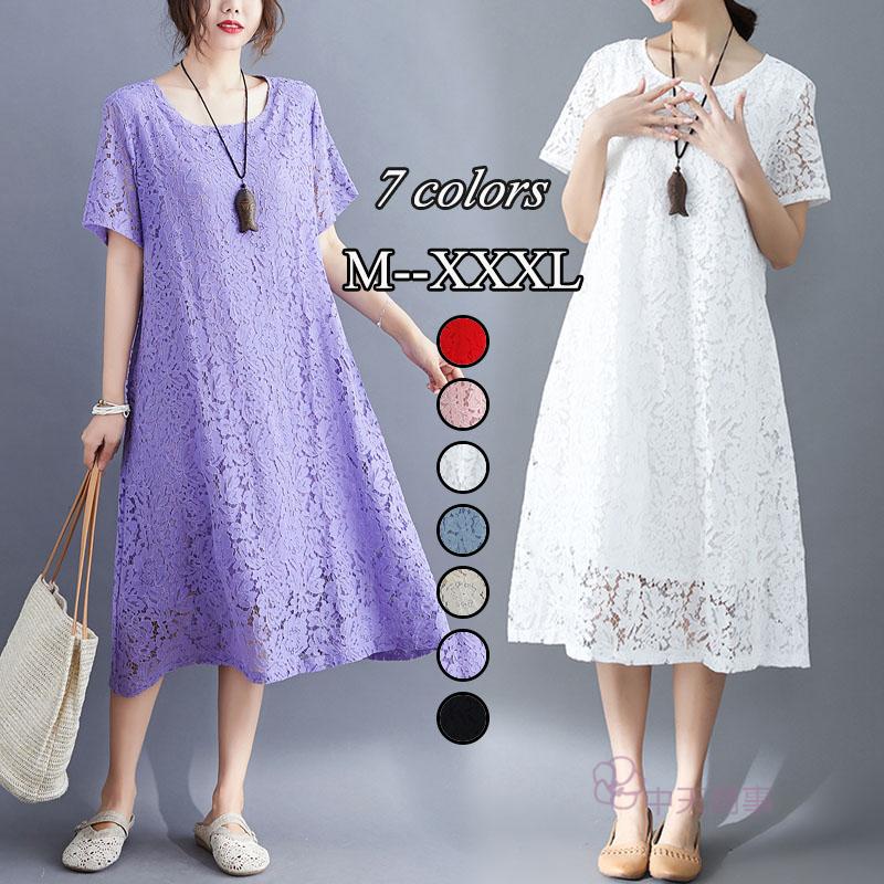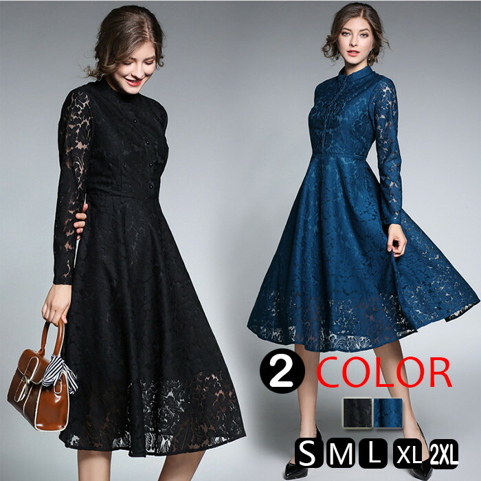 レディース ワンピース フレア ミモレワンピース レースワンピ ライン 二次会 体型カバー 森ガール