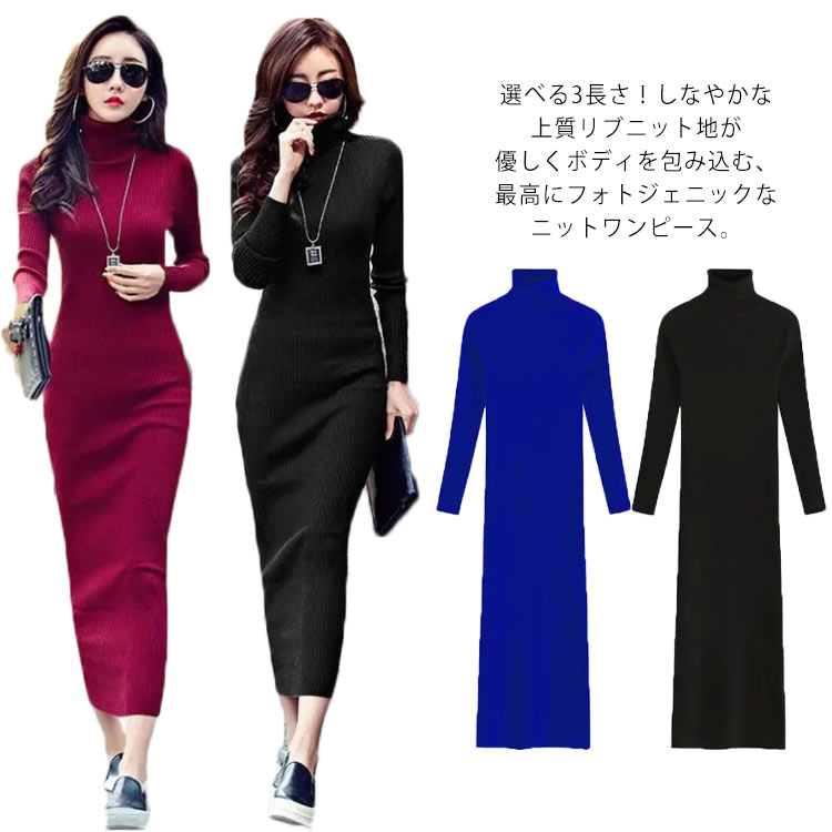 レディース ニット 選べる3長さ 秋 大きいサイズ マキシワンピース ワンピース ハイネック タイト 春 ロングワンピース