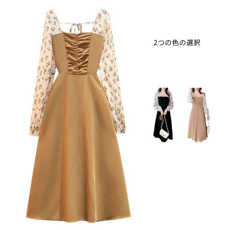 ロングワンピース 長袖 花柄袖 ロング丈 おしゃれワンピース インナーワンピース かわいい プリーツ フェミニン おしゃれ 花柄 フラワー