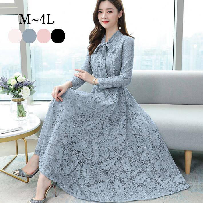 総レースワンピース 長袖 結婚式 透け感 フェミニン パーティードレス 発表会レディースファッション ワンピース