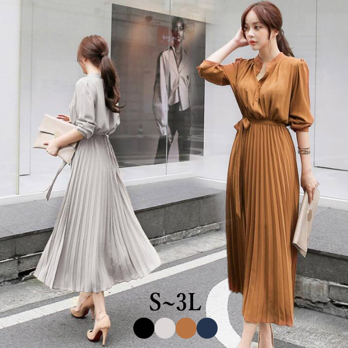プリーツワンピースプリーツフリルワンピースワンピースロウエストベルト付き フレンチスリーブ ワンピロングマキシ丈 ライン 長袖小さいサイズ大きいサイズ エレガント春夏 23