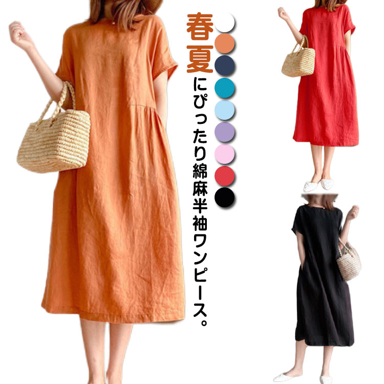 ゆったり リネンワンピース 綿麻混 リネン ミモレ丈 クルーネック ロングワンピース 無地レディースファッション ワンピース