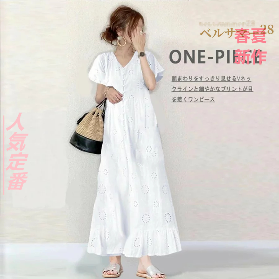 ワンピース 春 レディース きれいめ マキシワンピース 春夏 ワンピース vネック 白レーススカート オシャレ ワンピース ロングワンピース 半袖 上品