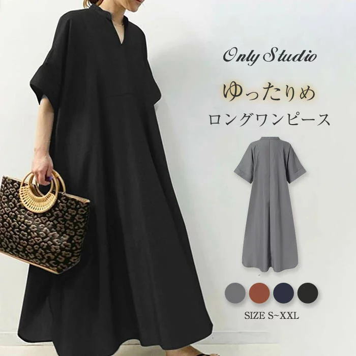 >ワンピース レディース ロングワンピース ロング丈 マキシ丈 半袖 ワンピ ロング ネック 無地 体型カバー ゆったり ゆるっとワンピース シンプル