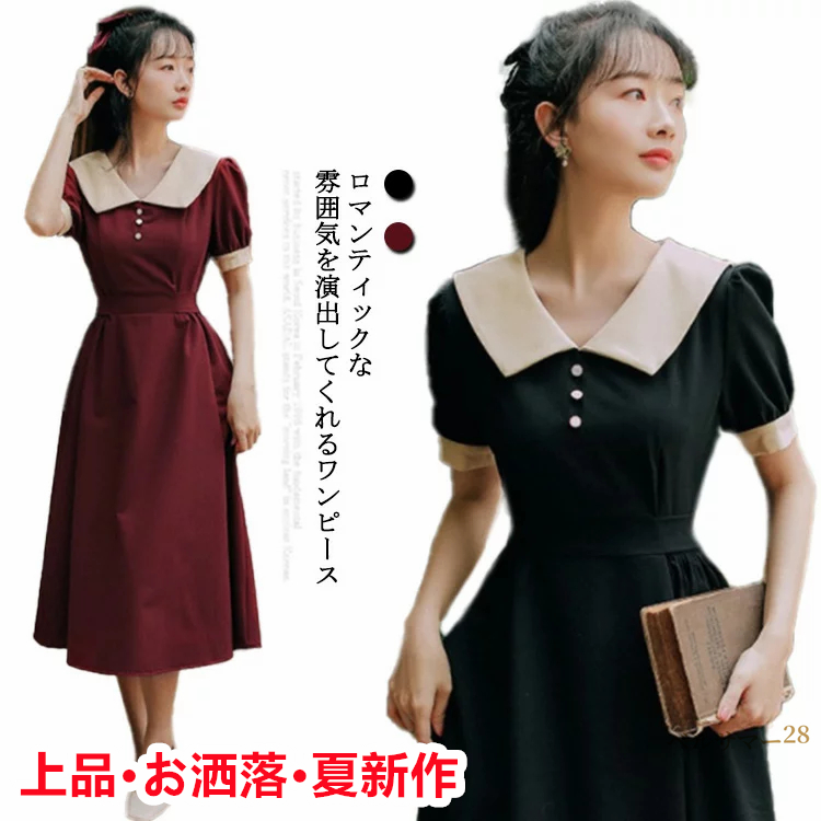 ワンピース ビッグカラー 半袖 ロングワンピ レトロ レディース おしゃれ きれいめレディースファッション ワンピース
