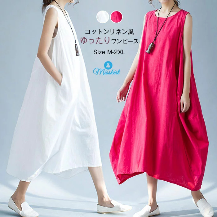 リネンワンピース 綿麻ノースリーブ ロングワンピース レディース 春 夏 ミモレ丈 無地 体型カバー ギャザー入り ゆったり 大きいサイズ