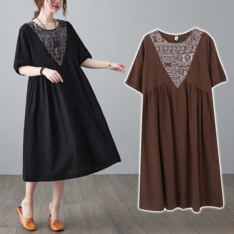 ワンピース 夏 レディース きれいめ ロング 半袖 ミモレ 幾何柄 無地 ファッション おしゃれ 綿麻 ゆったり 大きいサイズ L XL 2colors ミモレ丈 30代 40代 50代 普段着