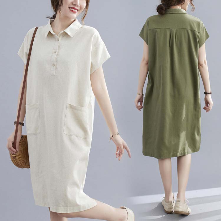 シャツワンピース 夏 半袖 キレイめ 膝丈 シャツ ワンピース ゆったり ワンサイズ 2色選べる 大きいサイズ 普段着 外出 綿麻 白 カジュアルウェア ホワイト グリーン