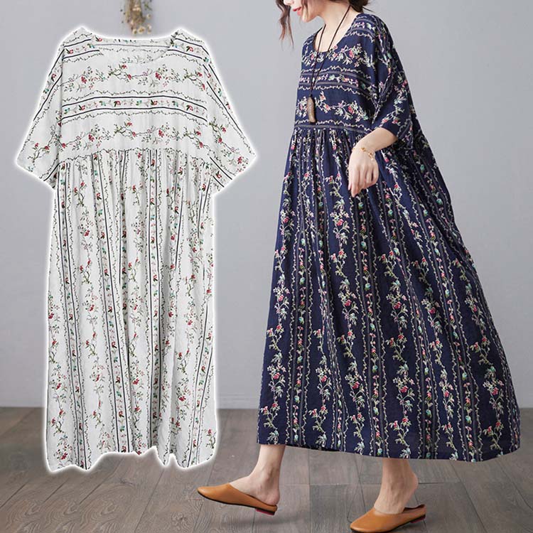 ワンピース 夏 レディース きれいめ 春夏 ドレス 五分袖 ロング丈 花柄 総柄 ゆったり 快適 大きいサイズ ビンテージ 綿麻 大きいサイズ L XL カジュアル マタニティ 妊婦