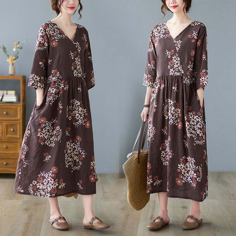 ワンピース 夏 レディース きれいめ ロング丈 花柄 総柄 vネック 七分袖 ポケット付き ゆったり 腰締め 大きいサイズ 着痩せ 体型カバー M L XL 2XL ビンテージ 綿麻 撮影