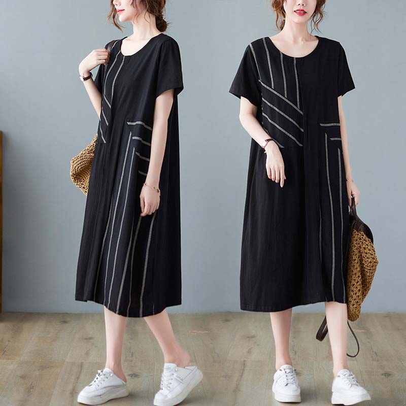 ワンピース 夏 レディース きれいめ ロング丈 黒 半袖 ストライプ柄 ビンテージ 襟抜き シンプル ゆったり 大きいサイズ M L XL ハイウェスト 30代 40代 50代 ママ 母