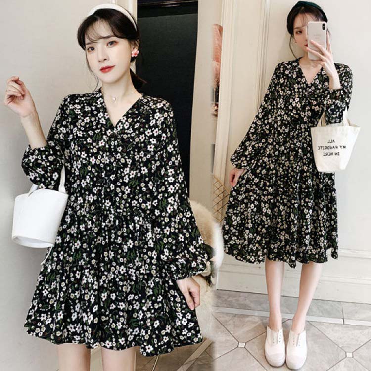 ワンピース レディース 長袖 きれいめ 膝丈 春夏秋 花柄 総柄 シフォン フリル 体型カバー 着痩せ マタニティ vネック 可愛い かわいい おしゃれ ファッション ゆったり