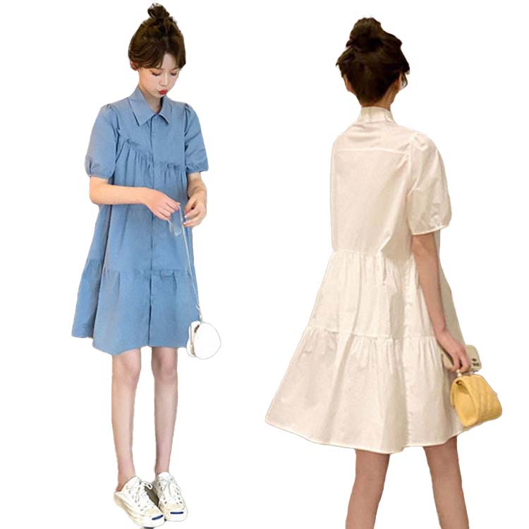ワンピース 夏 レディース きれいめ 半袖 膝丈 春夏 ドレス パフ袖 フリル 折り襟 シャツワンピース 無地 セレブ 2色選べる 普段着 日常 学生 通学 撮影 写真 通勤 仕事