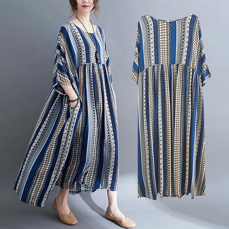 ワンピース 夏 レディース きれいめ 半袖 リゾート 春夏 ロング 七分袖 フレンチスリーブ ボヘミアン風 ストライプ柄 ゆったり 大きいサイズ ワンサイズ フリーサイズ