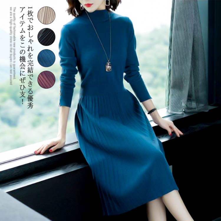 ニットワンピース レディース ニット ニットワンピ プリーツ 長袖カシュクール ラウンドネック ワンピ エレガント きれいめ大人 オフィス