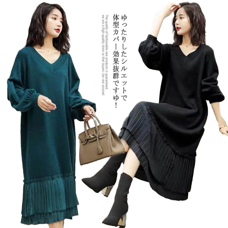 ニットワンピース ニット ワンピース レディース 秋冬 春 vネック 長袖 きれいめ ゆったり 大きいサイズ マタニティ 裾 切り替え プリーツ ロング丈 体型カバー 上品