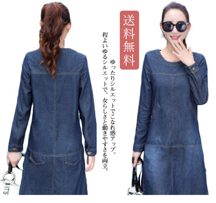 デニムワンピース レディース 長袖 ポケット付き ロングワンピース ゆったり シンプル 体型カバー デニム ワンピース 大きいサイズ カジュアル リラックス 普通着