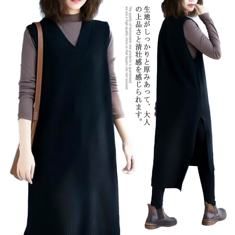 ニットワンピース ノースリーブ ジャンパースカート ロング丈 Vネック 無地 重ね着 秋 冬 体型カバー ベストワンピース レディース ニット ワンピース
