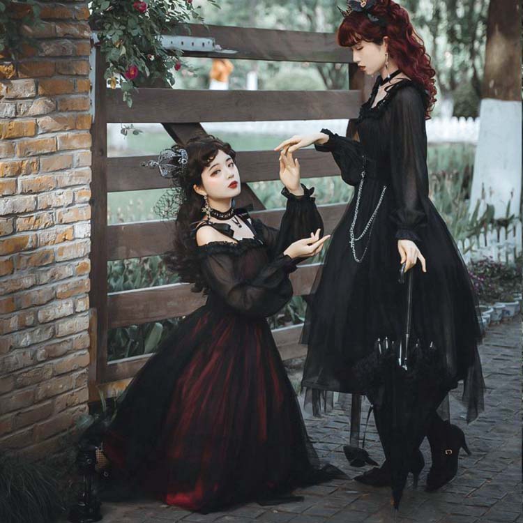ワンピース ロリータ ゴシック 長袖 ロリータ服 膝丈 暗黒 ワンピース ジャンパー スカート チュール ゆったり チェーンベルト Lolita 学園祭 大人 フリル コスプレ衣装