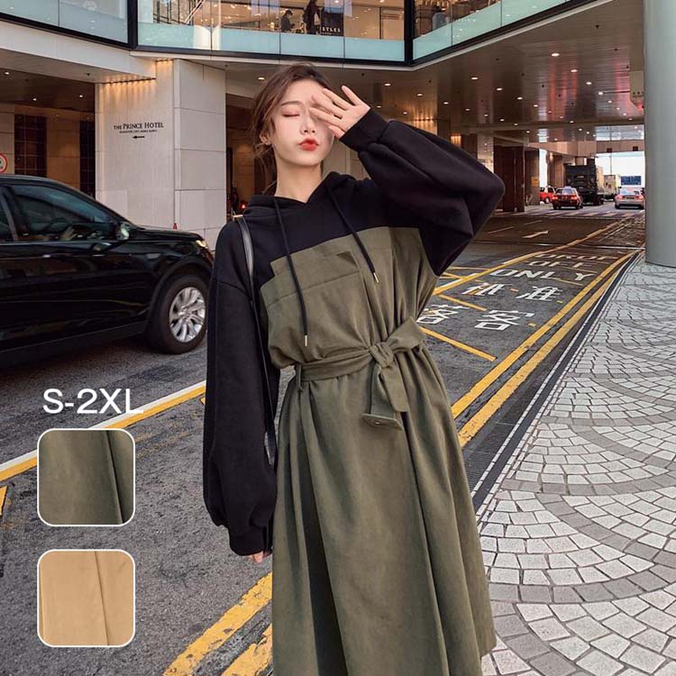 フード付きワンピースロング丈長袖パーカ風ベルト付ゆったり体型カバー春秋レディース着回し人気カジュアルAライン
