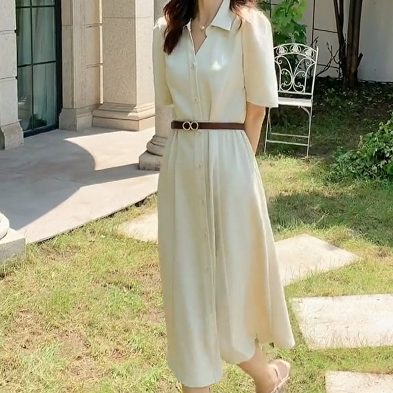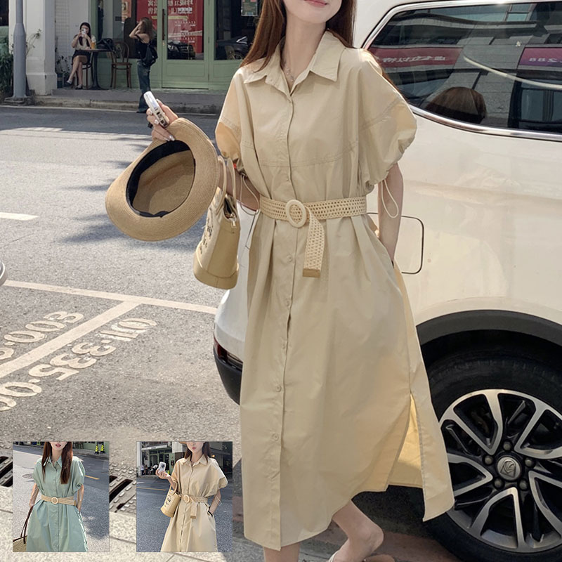 シャツワンピース 夏 ロング 半袖 きれいめ レディース 大きいサイズ 折り襟 腰 リボン飾り 無地 ポロシャツ M L XL 2XL ゆったり 大きいサイズ 3色選べる 綿麻 マタニティ