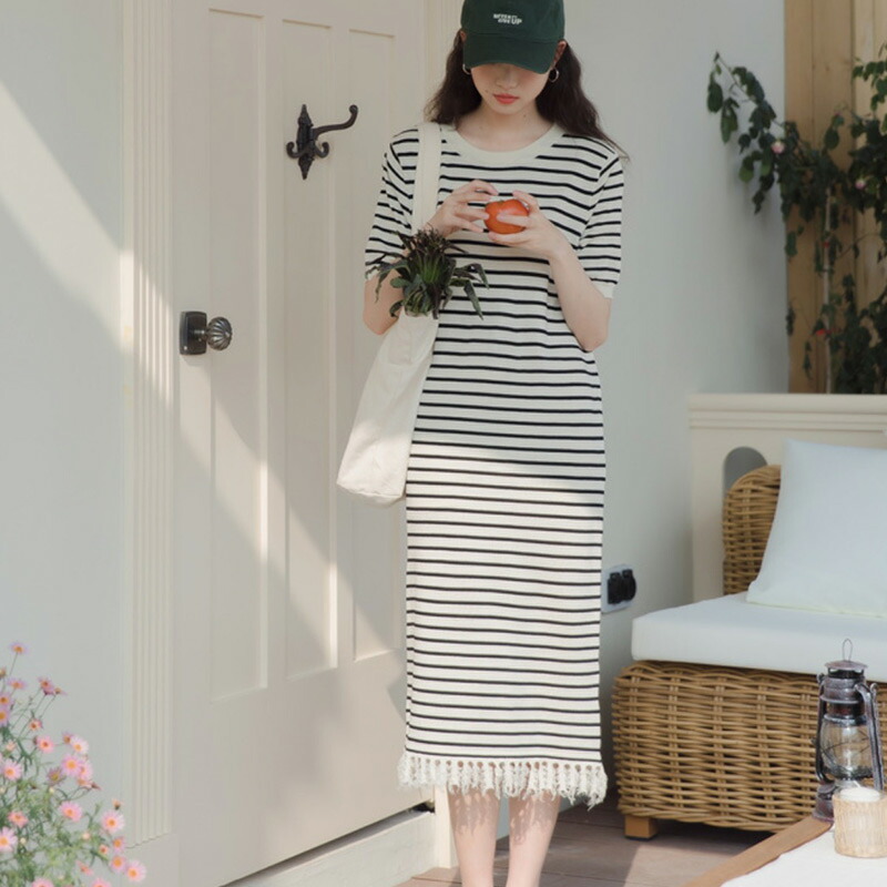 レディースワンピース 着痩せ 半袖 丸襟ワンピース ラインワンピース ミディアム 白襟 ミニ丈 ショート タイト