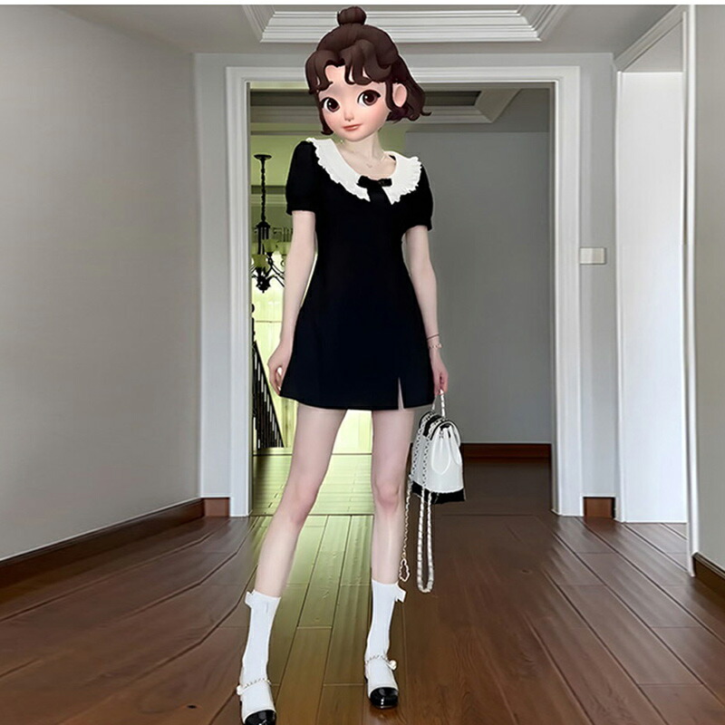 レディースワンピース 着痩せ 半袖 丸襟ワンピース Aラインワンピース ミディアム 白襟 ミニ丈 ショート タイト