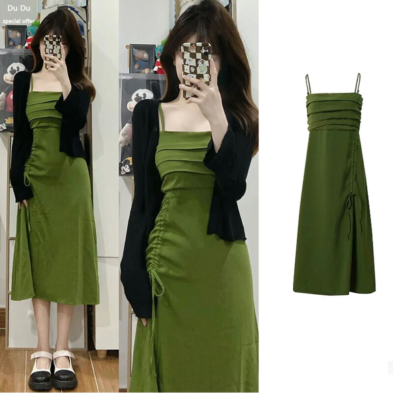吊りワンピ Vネック レディーススーツ 長袖 膝丈 カジュアル 上下セットレディースファッション ワンピース