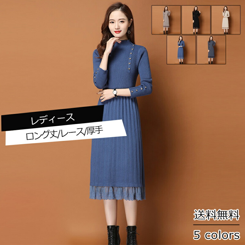 ワンピース レディース ニットワンピース ロング丈 長袖 レース ニット 裏起毛 厚手 切替 リブ 着痩せ 秋 冬 ガーリー 暖かい きれいめ おしゃれ