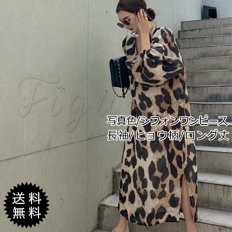 シフォンワンピース ワンピース シフォン レディース 長袖 ヒョウ柄 ロング丈 Vネック スプリット ランタンスリーブ 体型カバー 着痩せ カジュアル 春秋 きれいめ おしゃれ
