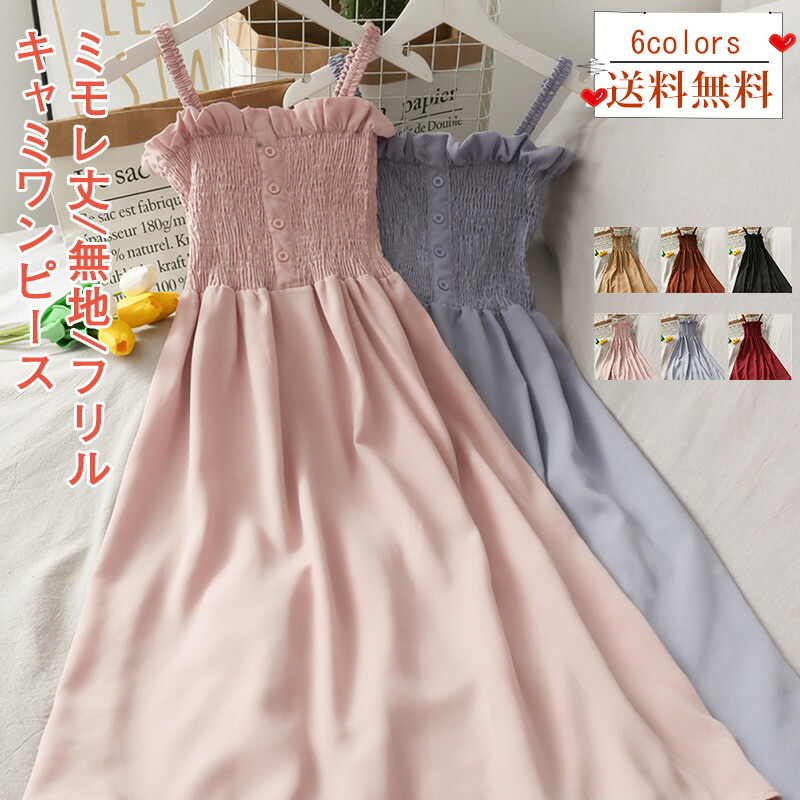 キャミワンピース レディース ワンピース 無地 ノースリーブ Aライン ミモレ丈 ロング丈 フリル襟 カジュアル ハイウエスト 着痩せ きれいめ おしゃれ