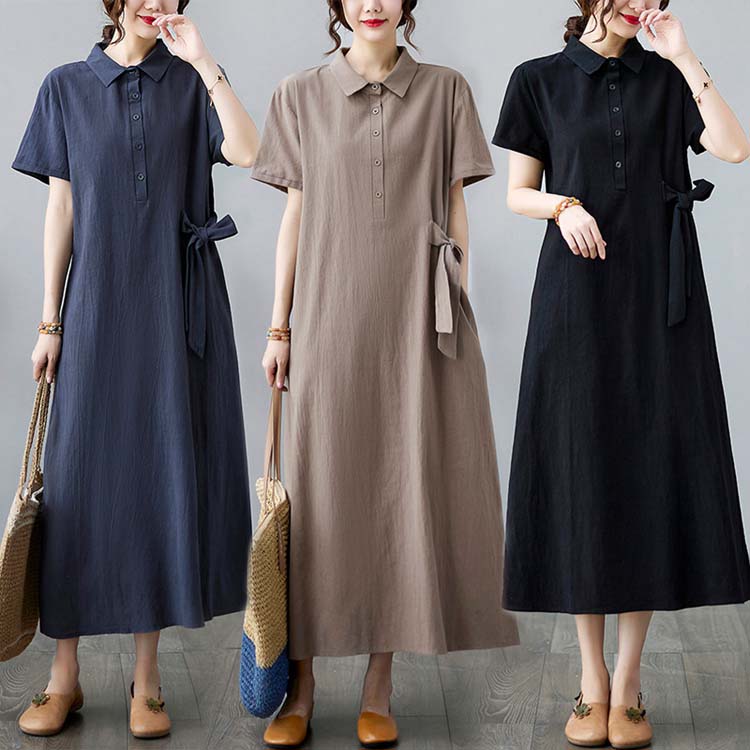 シャツワンピース 夏 ロング 半袖 きれいめ レディース 大きいサイズ 折り襟 腰 リボン飾り 無地 ポロシャツ 2 ゆったり 大きいサイズ 3色選べる 綿麻 マタニティ