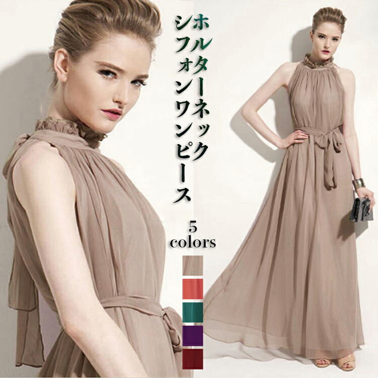 ホルターネック ドレス ワンピース ロング マキシ丈 ノースリーブ 夏 無地 8色展開 ウエストリボン フレア イベント 休日 お呼ばれ パーティー 二次会 女子会 エレガント きれい