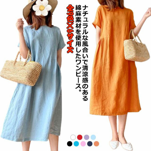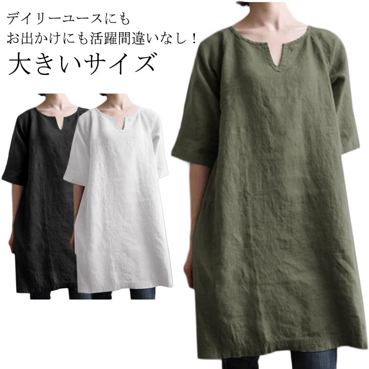 半袖 ロングTシャツ チュニック レディース ワンピース コットン 麻 リネン ワンピース ひざ丈 麻ワンピース 大きいサイズ