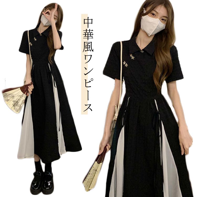 ワンピース 半袖 きれいめ ロング 夏 中華風ワンピース ロングワンピース おとな フレアワンピース かわいい レディース ラインワンピース 黒 春