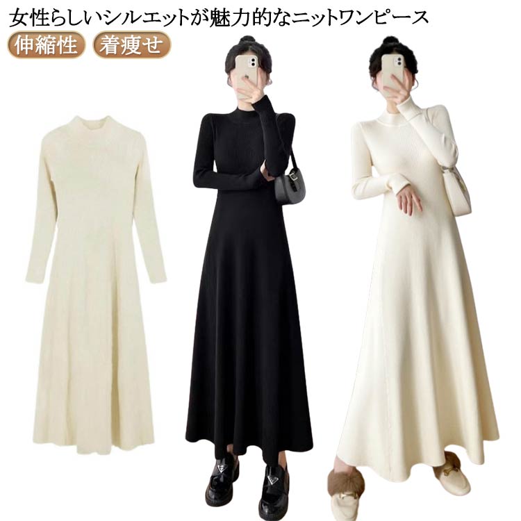 女らしいメリハリシルエットのニットワンピース ルーズフィット リブニット ワンピース 長袖 ミモレワンピース プルオーバー ハイネック 暖かい 防寒 冬ワンピース ひざ下