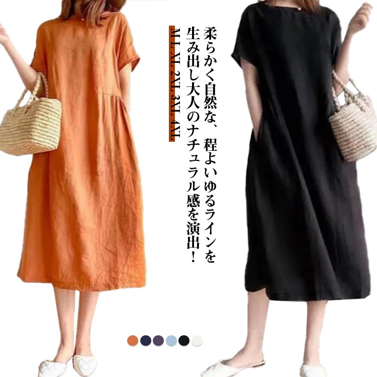 M~4XL ロング丈ワンピース 半袖 綿 ナチュラル 大人可愛い 体型カバー 薄手レディースファッション ワンピース