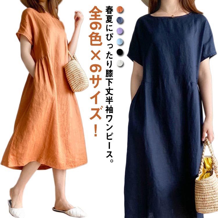 ラウンドネック 膝下 ワンピース 綿 ポケット付き カジュアル ゆったり 春夏 薄手レディースファッション ワンピース