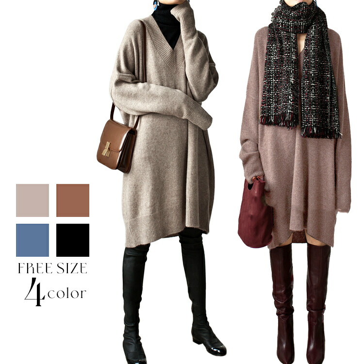☆2点目300円OFFクーポン☆ 今季注目 シンプル エレガント Vネック ニットワンピースレディース 秋冬 レディースワンピース Vネック 秋カラー 長袖 ニットワンピ 膝丈 ミディアム丈