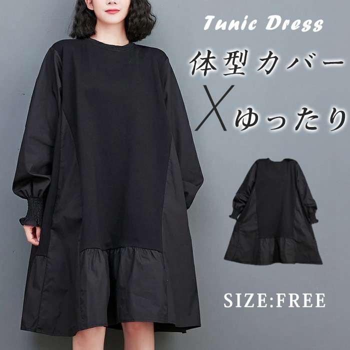 チュニックワンピ ワンピース 長袖 バルーンスリープ 春 秋 レディース きれいめ ぽわん袖 ゆったり 異素材 着やせ 体型カバー ビッグシルエット パッチワーク カジュアル