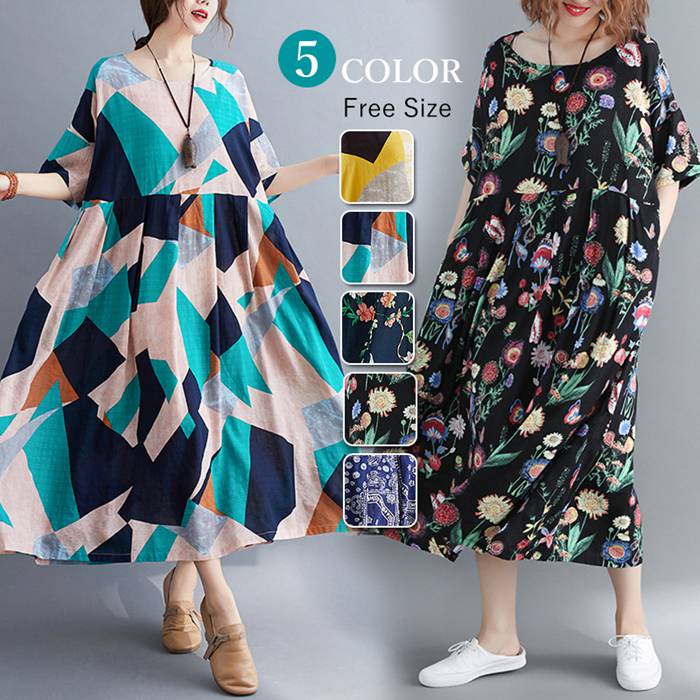 ロングワンピース ワンピース レディース マキシワンピース エスニックワンピース 綿麻風 花柄 総柄 プリント リゾートワンピース エスニック ワンピ 五分袖 半袖 大人 夏