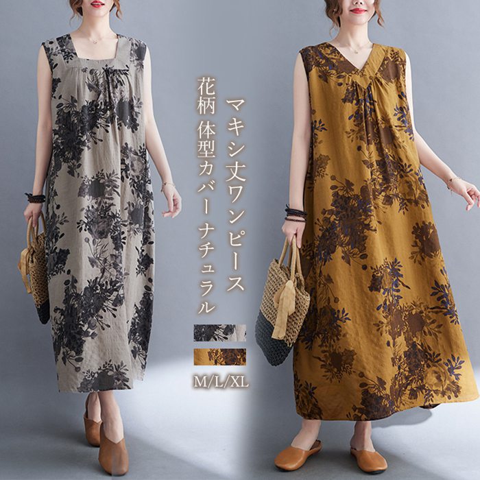 マキシ丈ワンピース レディース 花柄ワンピース ノースリーブ キレイめ 春 夏 ロング丈 インナー 森ガール ゆったり スクエアネック ネック 2 ゆるシルエット 体型カバー