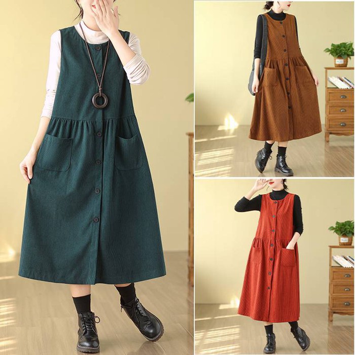 ワンピース ジャンパースカート スキッパー ジャンスカ ネック 膝丈 ミディ丈 ミディワンピー ライン 着痩せ 体型カバー コーデュロイ