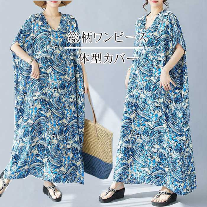 ロングワンピース ワンピース レディース Vネック 花柄 体型カバー ゆったり 半袖 フレアワンピース