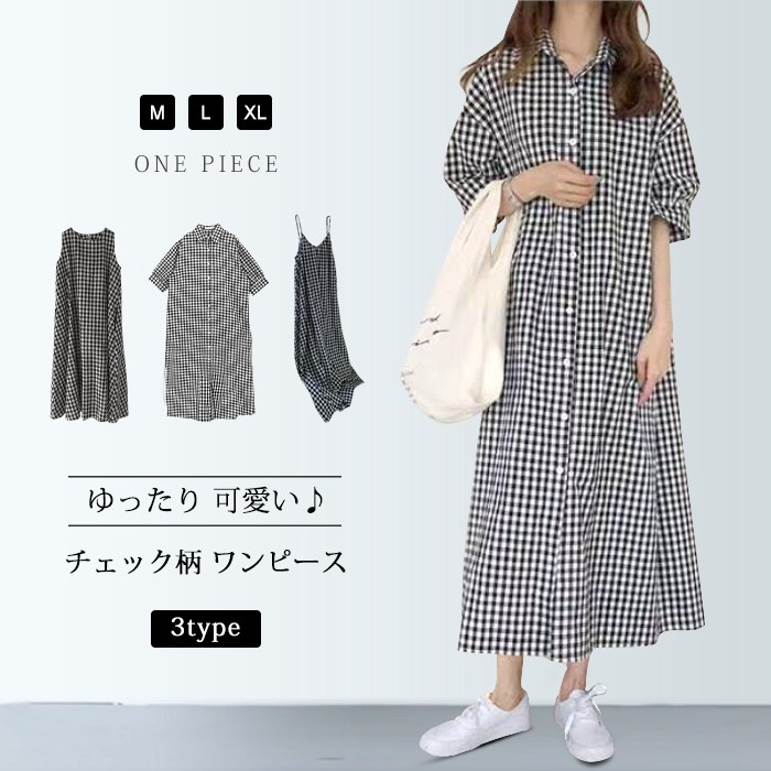 チェック柄 ワンピース ギンガムチェック ロングシャツ 3type シャツワンピ 半袖レディースファッション ワンピース