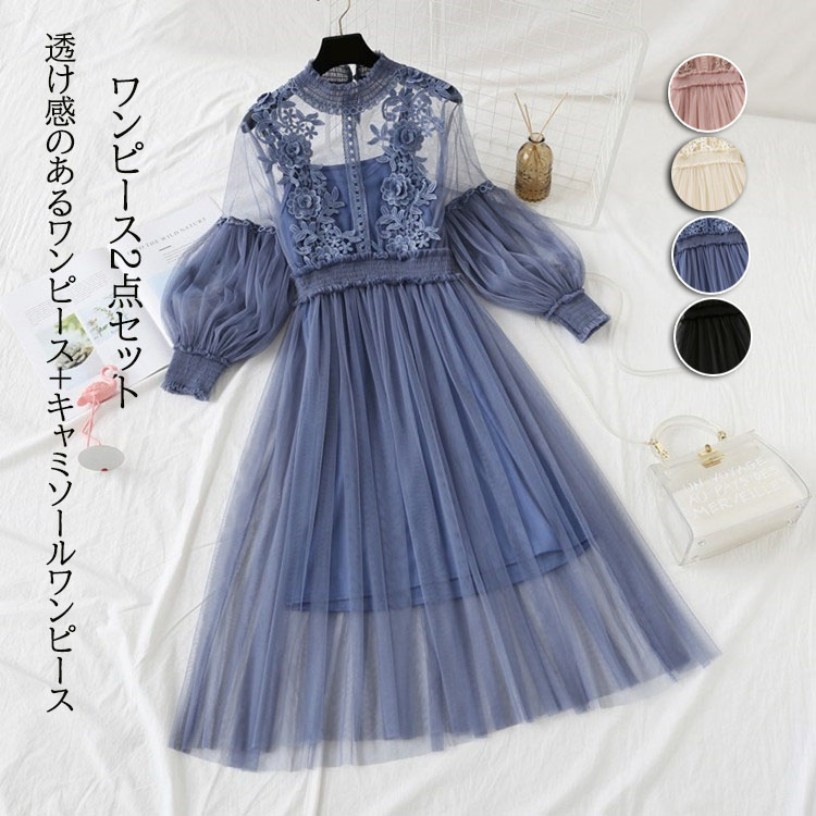 透け感のあるワンピース+キャミソールワンピース 2点セット☆フェミニンさ溢れる刺繍チュールワンピース