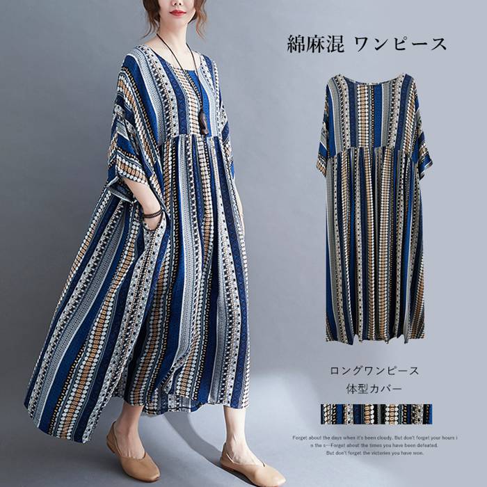 綿麻混 ワンピース ロングワンピース リゾートワンピース 夏 半袖 マキシワンピ マキシ丈 大人 チュニックワンピース ボヘミアン ビーチ リゾート 旅行 カラフル 柄 おしゃれ 体型カバー