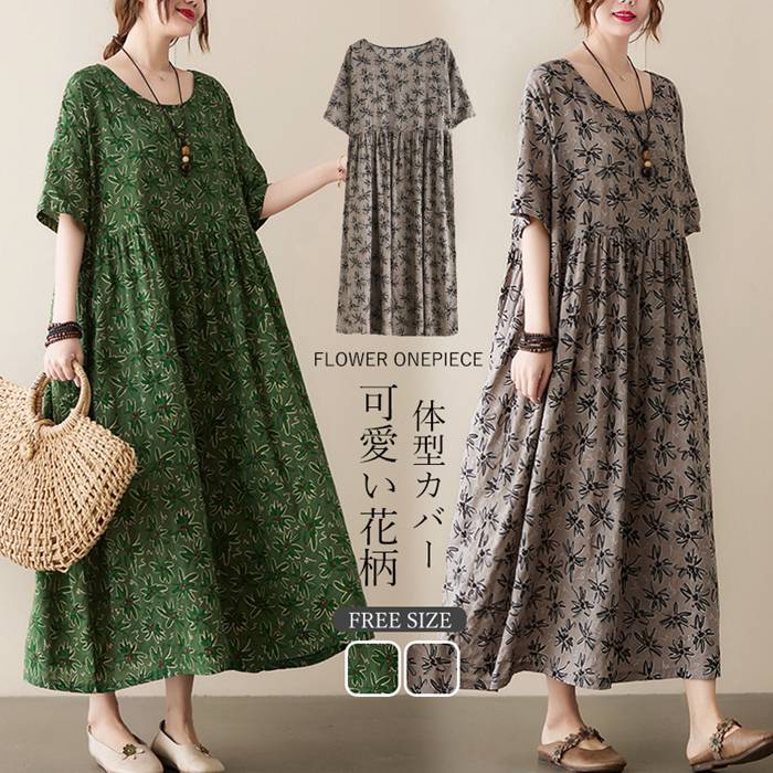 ロングワンピース ワンピース レディース 春 夏 きれいめ マキシ丈 マキシワンピ ロングワンピ 体型カバー シンプル 半袖 総柄 花柄 可愛い ネック 着瘦せ エレガント 旅行