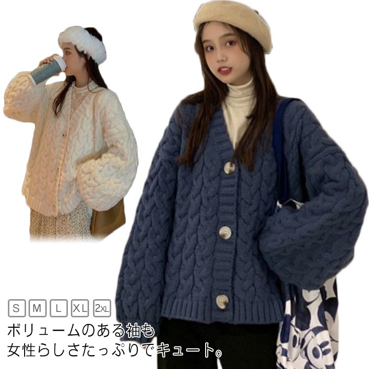 ゆったり レディース ケーブル編み アウター ニットカーディガン 前開き ネック カーディガン ニット トップス